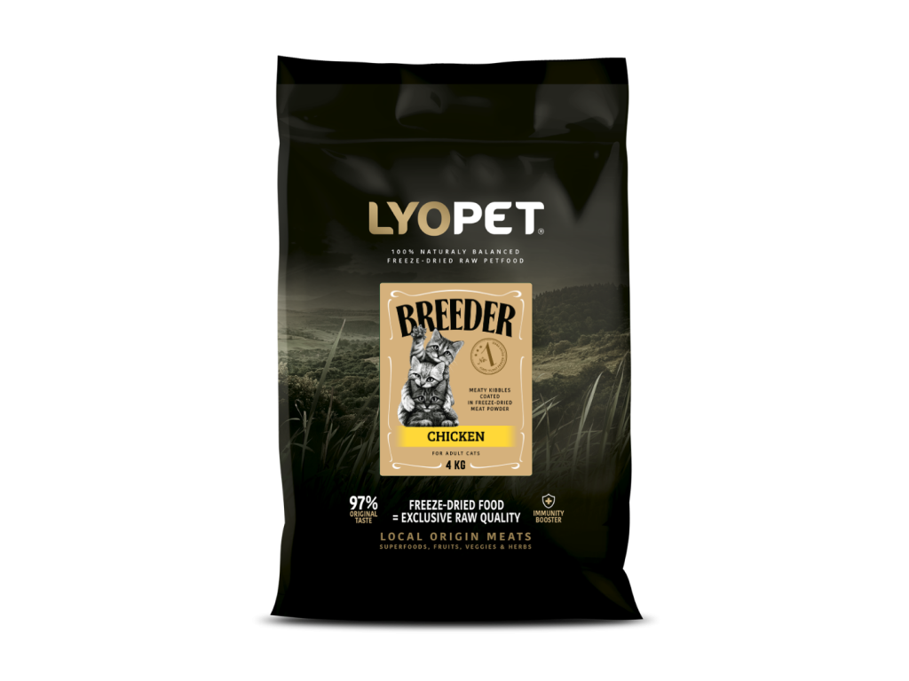 Breeder, to jsou české hypoalergenní granule pro kočky, které si díky inovativnímu a šetrnému zpracování pomocí lyofilizace neboli sušení mrazem plně zachovávají přirozený obsah výživových hodnot všech použitých surovin.