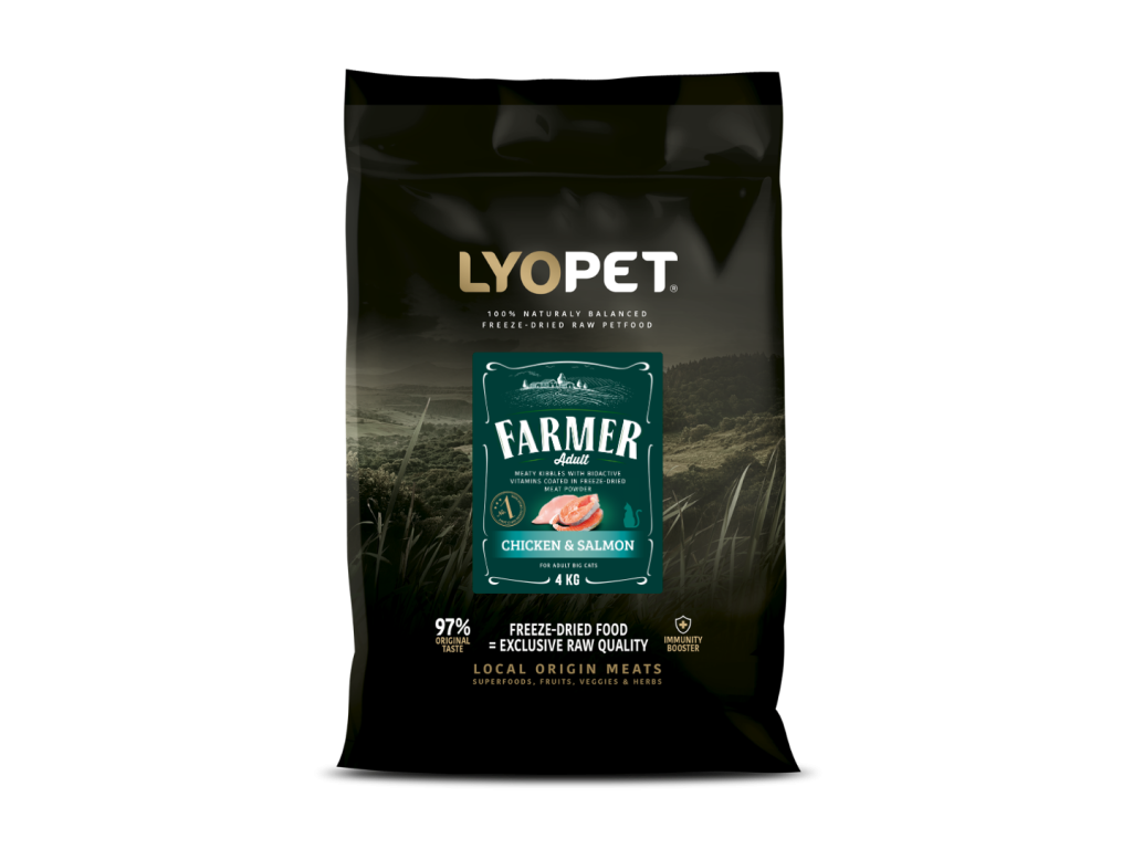 Lyopet Farmer je kompletní superprémiové krmivo pro velké kočky. Obsahuje kuřecí a tuňákové granule, šetrně zpracované za nízkých teplot a obalené v mase sušeném mrazem a BIO kolostru. Kvalitní granule pro kočky s vysokým obsahem masa, bez chemie a konzervantů.