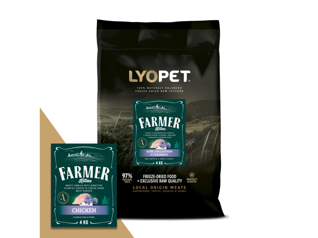 Lyopet Farmer je kompletní superprémiové krmivo pro koťata a březí kočky. Obsahuje kuřecí granule, šetrně zpracované za nízkých teplot a obalené v mase sušeném mrazem a BIO kolostru. Kvalitní granule pro koťata a kočky s vysokým obsahem masa, bez chemie a konzervantů.