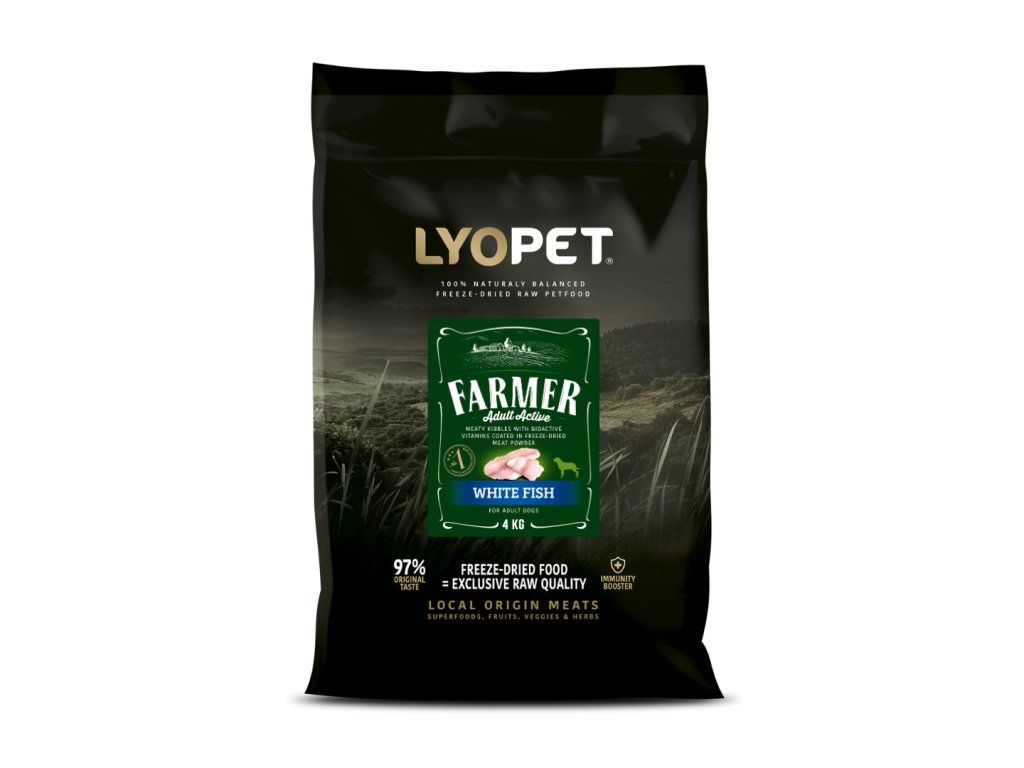 Lyopet Farmer je kompletní superprémiové krmivo pro aktivní psy. Obsahuje masové psí granule, šetrně zpracované za nízkých teplot, obalené v mase sušeném mrazem a v BIO kolostru. Kvalitní granule pro psy s vysokým obsahem masa, bez chemie a konzervantů.