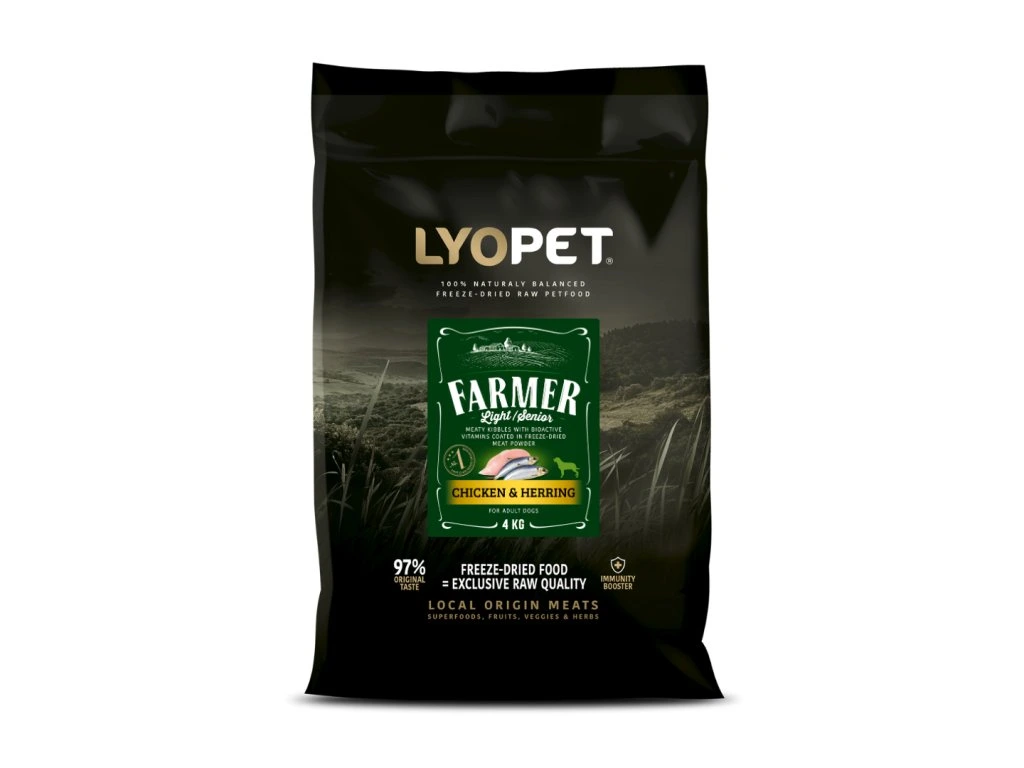 Lyopet Farmer Light je kompletní superprémiové krmivo speciálně navržené pro psy seniory a pro psy s nadváhou. Obsahuje masové psí granule, šetrně zpracované za nízkých teplot, obalené v mase sušeném mrazem, arktickém krillu a v BIO kolostru. Dietní granule pro psy s vysokým obsahem masa, bez chemie a konzervantů.