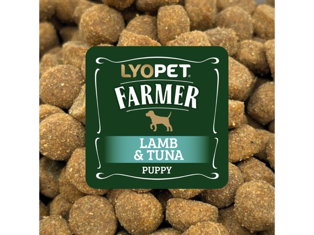 Lyopet Farmer Puppy Lamb & Tuna (Jehněčí s tuňákem) je kompletní superprémiové krmivo vyvinuté pro podporu zdraví štěňat. Vysoký podíl masa zahrnuje čerstvé jehněčí a tuňákové maso, šetrně zpracované za nízkých teplot a obalené v mrazem sušeném mase, aby si zachovalo maximum živin i chuti. Přidané kolostrum podporuje přirozenou obranyschopnost díky imunoglobulinům.