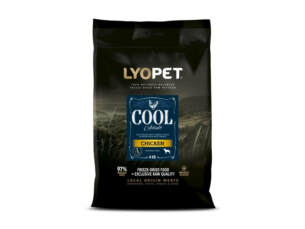 Cool je kompletní superprémiové krmivo pro psy všech plemen. Obsahuje kuřecí granule, šetrně lisované za studena a obalené v mase sušeném mrazem. Monoproteinové granule pro psy s vysokým obsahem masa.